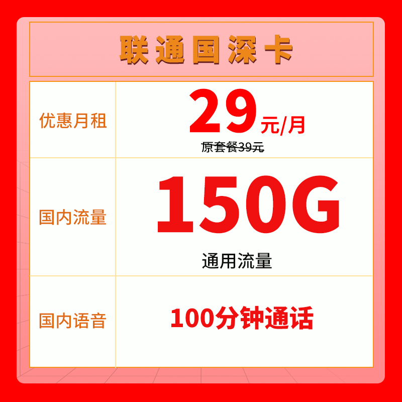 29元150G通用流量+100分钟通话-仅发省内【结佣要求:激活当月累充100元,次月在网非三无】